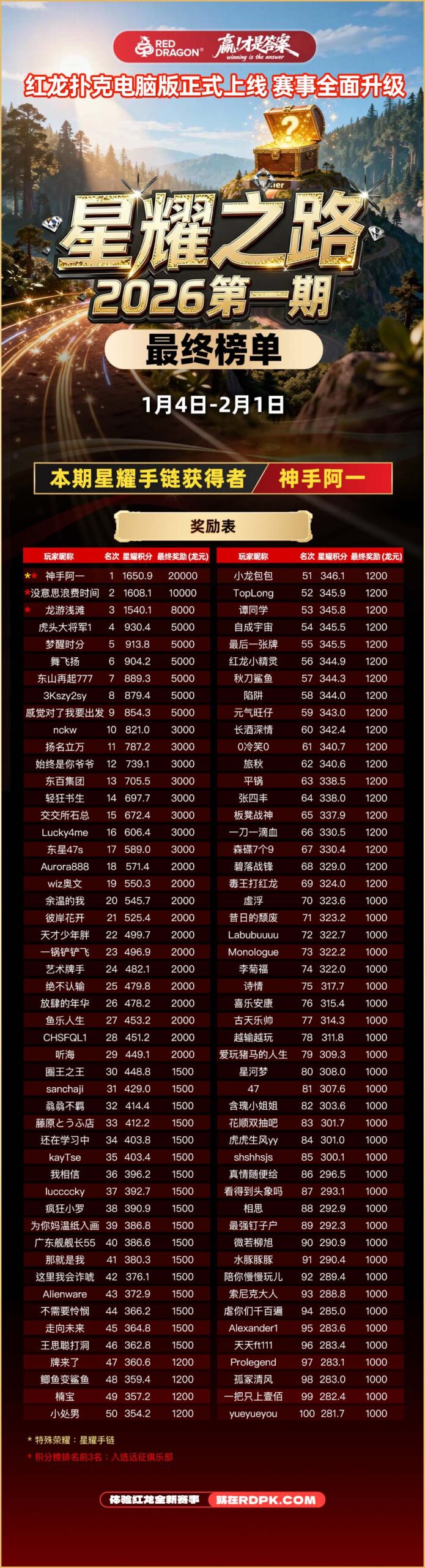 2026年2月2日 – 3月1日第二期通往巅峰的荣耀之路,已完结! 恭喜本期星耀手链获得者:3Kszy2sy 星耀之路第三期已经开启,活动时间 2026年3月2日 – 3月29日 活动核心亮点 活动玩法说明 星耀积分越高,最终名次越靠前,获得的奖励也越丰厚。 为什么要参加星耀之路?